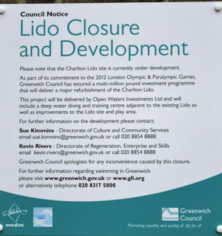 According to Open Waters is in discussions with another – unnamed – organisation about transferring the lease. Rumours I’ve heard include Greenwich Leisure Limited taking the lido on, building a heated Olympic-sized pool by summer 2012. GLL runs all Greenwich borough’s other pools… and ran Charlton Lido before the Open Waters deal was signed.