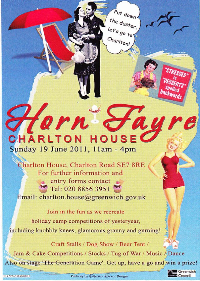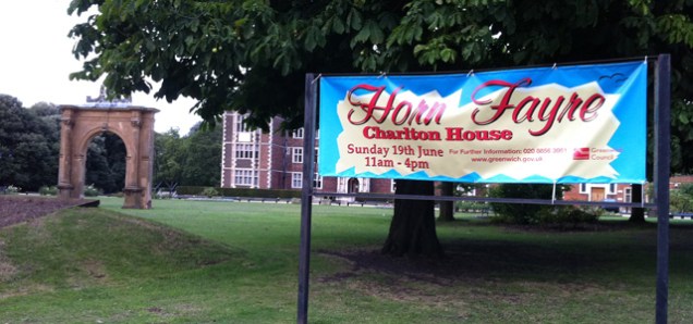 It’s the traditional Horn Fayre in Charlton Park this Sunday from 11am-4pm. I wish I could tell you lots of information about what’s planned, but there’s nothing at all – no mention in Greenwich Council’s Greenwich Time weekly, just a banner outside Charlton House referring you to the council website where you’ll find no editorial on it at all.