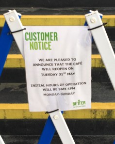 The cafe (closed for refurbishment since October last year) is due to re-open next Tuesday, and will be open 9-5pm through the week. We assume this also means that the sun terraces will re-open.