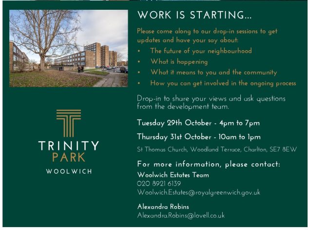 The two sessions, at St Thomas Church on Woodland Terrace, will feature representatives from the council and Lovell, the company which is rebuilding the Connaught Estate in Woolwich as Trinity Walk.