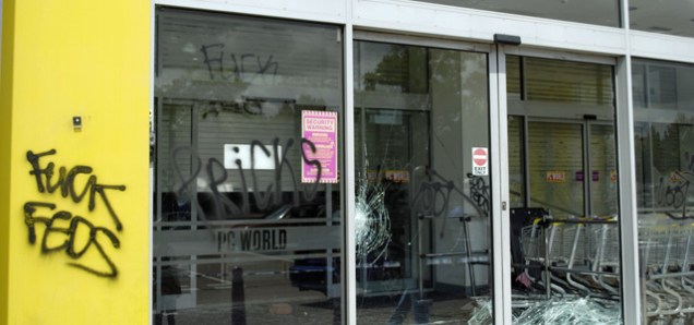 After watching disturbances in Lewisham on rolling news since I arrived home from work it was hard to rule out something happening in the retail parks opposite my house. I had popped out to Asda at 8.30 just as the sun was going down. Despite increasing numbers of police cars rushing along Woolwich Road it actually seemed fairly normal. I asked the Asda security guards whether they were about to close. They replied: “We’re staying open – for now.”