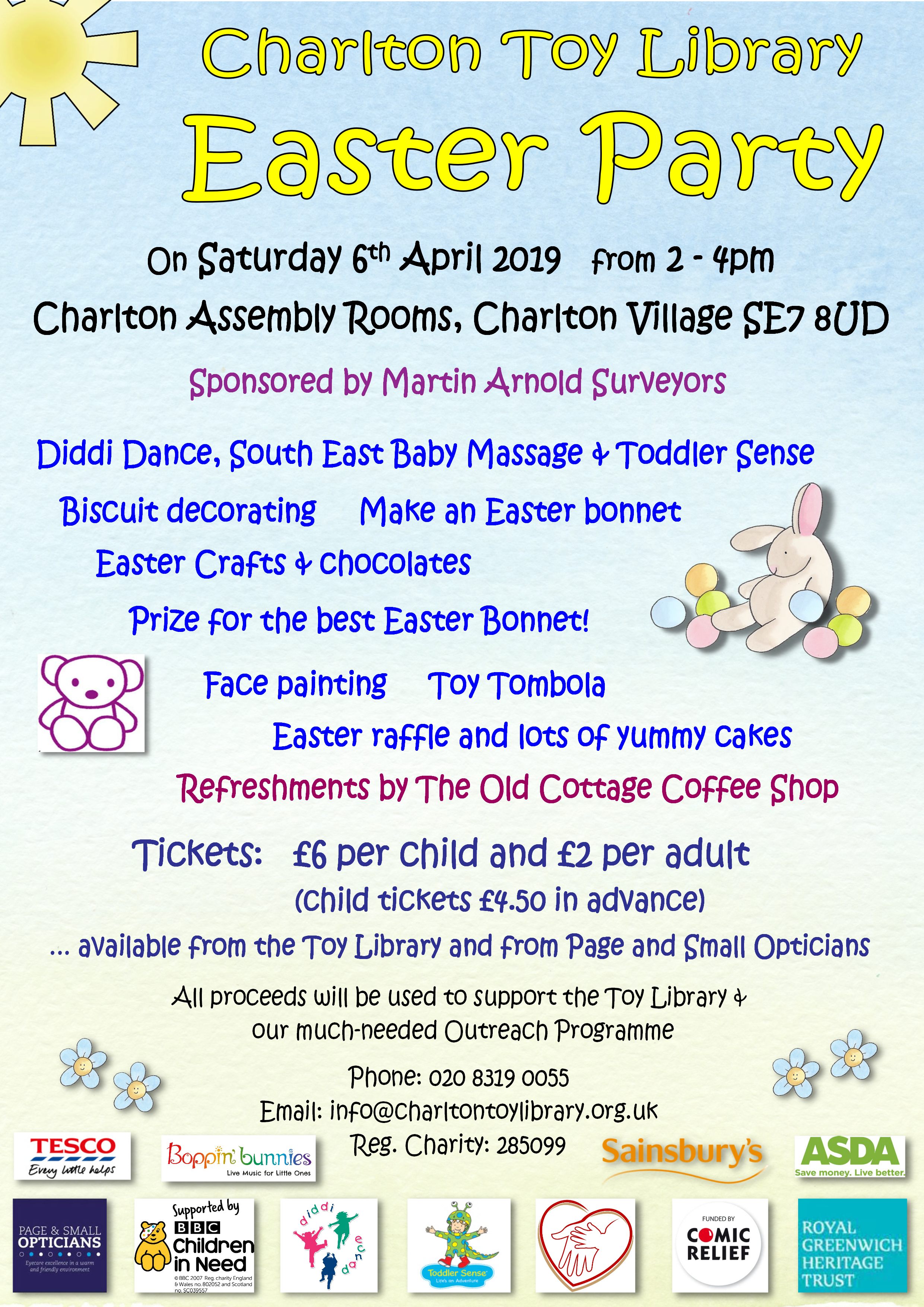 Charlton Toy Library are hosting an Easter Party fundraising event this Saturday, 6th April 2019, between 2-4 pm at Charlton Assembly Rooms. The Toy Library is a volunteer-run, independent organisation providing families with a place to come and meet other parents, play with their children or get advice, as well as running outreach services around the borough of Greenwich and some parts of Bexley. Tickets are £6 per child (£4.50 in advance), £2 per adult.