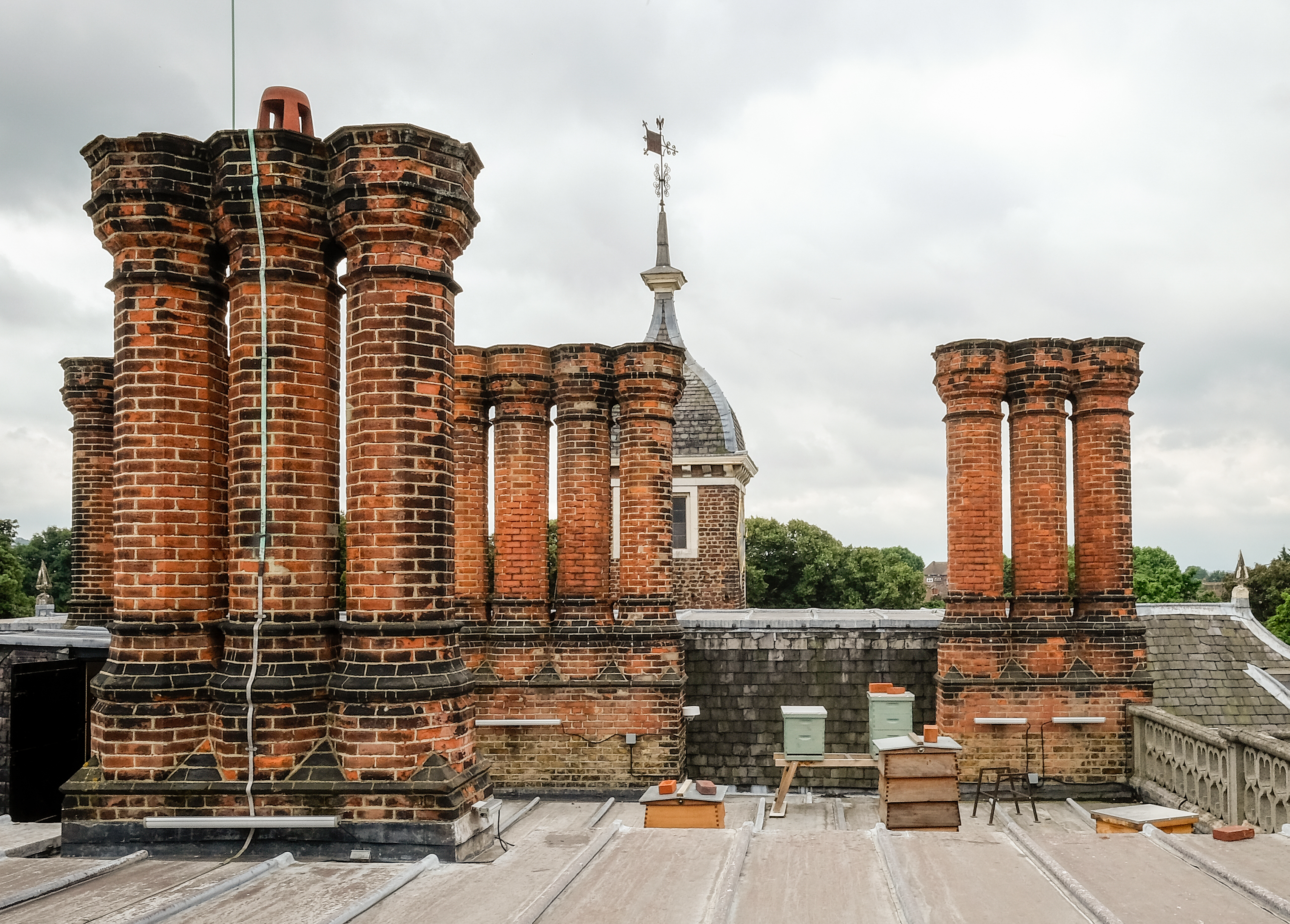 Bee hives amongst the chimneys on the roof of Charlton House.