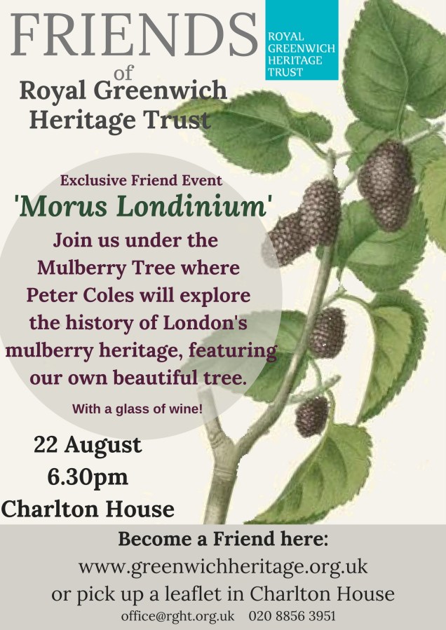 On Tuesday 22nd August ‘Morus Londinium’ looks at the heritage of London’s mulberry trees, including Charlton’s own. The latter is a Friends of Royal Greenwich Heritage Trust exclusive event – find out more about the Friends here.
