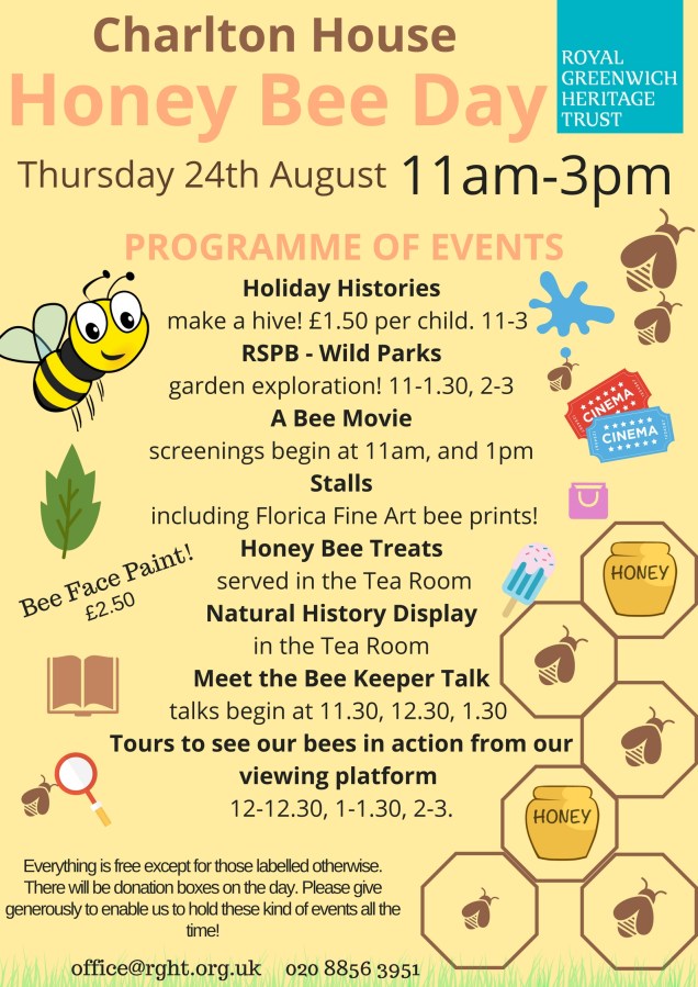 News in from Charlton House of two events happening next week – one celebrating the honey bee on Thursday August 24th (did you know there are thriving beehives on the roof of Charlton House?), including talks from a beekeeper, kids’ activities, and a chance to see the beehives.