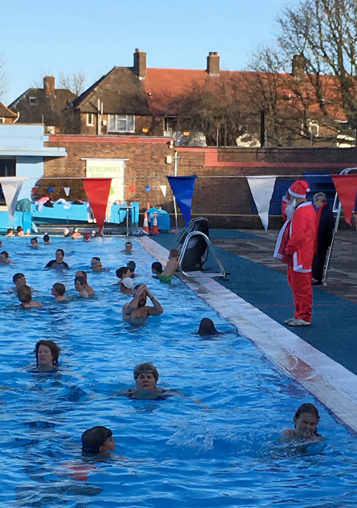 Swimmers enjoying the sunshine on Boxing Day last year. Thanks to Rosemary Leeke for the photo.Fancy a Christmas dip? Charlton Lido will be open to swimmers looking to get some post-Christmas Day exercise – or just a splash around and some fresh air – this Boxing Day morning. The heated pool will be open 9-11am, and tickets can be booked in advance here (and are cheaper than paying on the door).